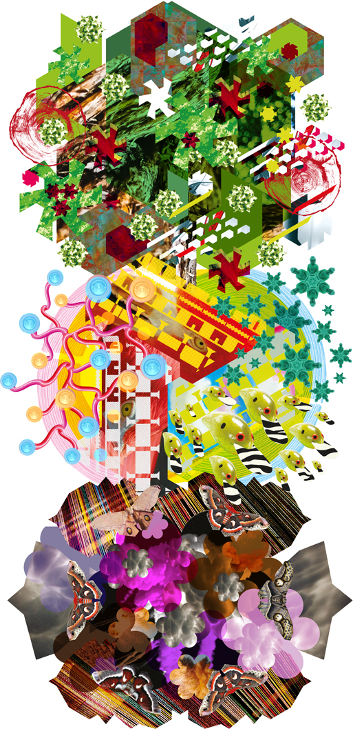 A private commission, this complex, illustrative collage representing three distinct musical pieces.